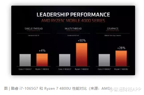 AMD 称,与 4800U 对标的是英特尔最新 10 纳米制程,使用 Ice Lake 架构的酷睿 i7-1065G7。两者相比,4800U 在单线程表现上略微超出 4%,多线程性能则大幅超出 90%,图形表现上超出 28%。