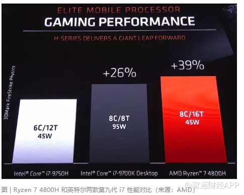 而 AMD 拿来与 4000 系列最强性能 Ryzen 7 4800H 对比的是 i7-9750H 和 i7-9700K。发布会幻灯片显示,在 3DMark FireStrike Physics 性能对比上,4800H 作为一款移动级处理器,其性能在保持能耗相同的情况下轻松超越 9750H 39%,还领先了能耗更高的 9700K 13%,后者可是一款桌面级处理器。