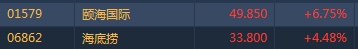 截至13时51分,颐海国际(01579)涨6.75%,报价49.85港元,海底捞(06862)涨4.48%,报33.8港元。