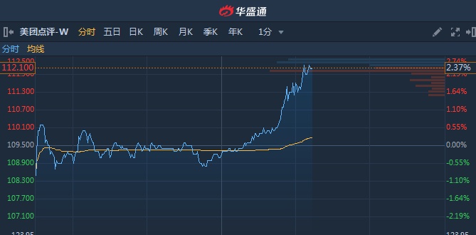 智通财经APP获悉,美团点评-W(03690)有望染蓝获北水持续加仓,午后直线拉涨逾2%,再度刷新历史新高。截至14时12分,涨2.37%,报价112.1港元,成交额17.88亿。