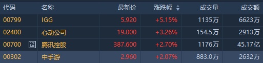 截至发稿,IGG(00799)涨5.15%,报5.92港元;心动公司(02400)涨3.26%,报19港元;腾讯(00700)涨2.6%,报387.2港元;中手游(00302)涨2.07%,报2.96港元。