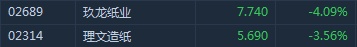智通财经APP获悉,纸业股今日高开低走,尾盘跌幅扩大,盘中玖龙纸业(02689)及理文造纸(02314)均跌超4%,截至15时3分,玖龙纸业跌4.09%,报价7.74港元,理文造纸跌3.56%,报5.69%。