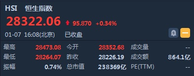 智通财经APP获悉,恒指早盘高开126.49点或0.45%,报28352.68点。截至收盘,恒生指数涨95.87点或0.34%,报28322.06点,全日成交额达864.19亿。国企指数涨0.34%,报11198.75点,红筹指数跌0.02%,报4519.67点。