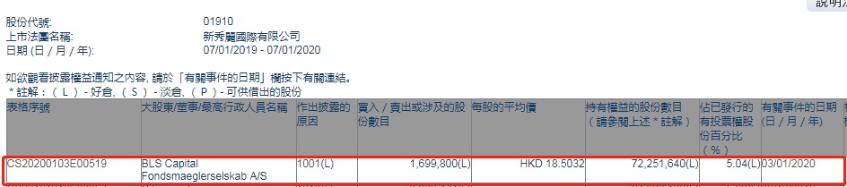 智通财经APP获悉,联交所最新资料显示,1月3日,BLS Capital Fondsmaeglerselskab A/S增持新秀丽(01910)169.98万股,每股作价18.5032港元,总金额约为3145.17万港元。增持后最新持股数目约为7225.16万股,最新持股比例为5.04%。