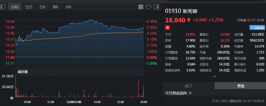 截至今日收盘,新秀丽跌涨5.25%,报18.84港元。