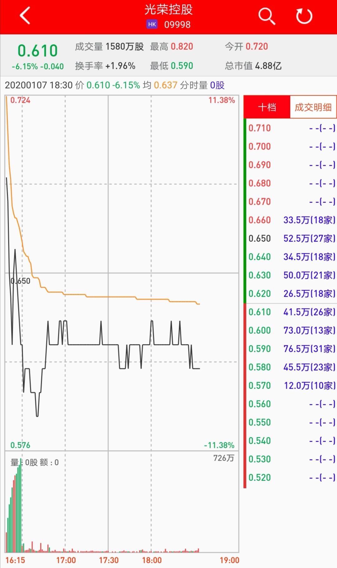 新股暗盘 | 光荣控股(09998)暗盘收跌6.15% 每手亏200港元