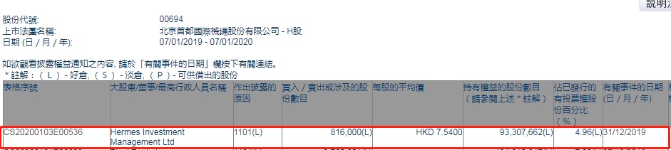 智通财经APP获悉,联交所最新资料显示,12月31日,Hermes Investment减持北京首都机场(00694)81.6万股,每股作价7.54港元,总金额约为615.26万港元。减持后最新持股数目约为9330.77万股,最新持股比例为4.96%。