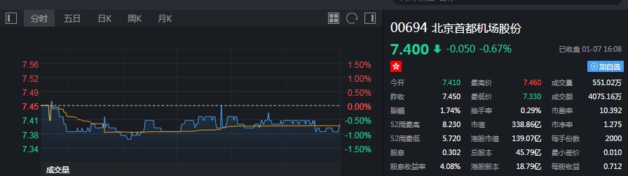 截止至今日收盘,北京首都机场跌0.67%,每股报价7.40港元。