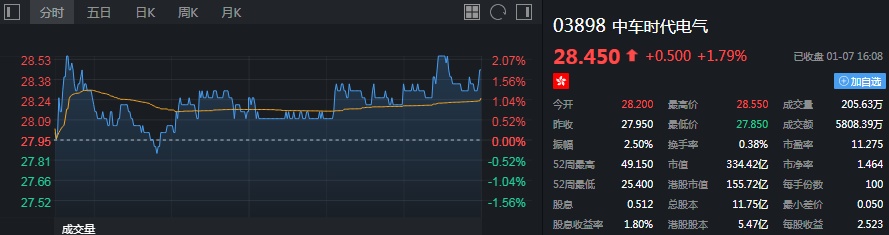 截止至今日收盘,中车时代电气涨1.79%,每股报价28.45港元。