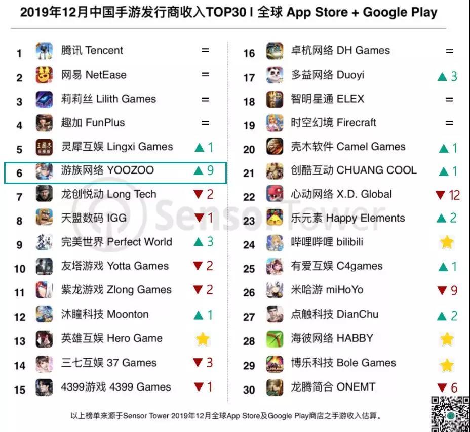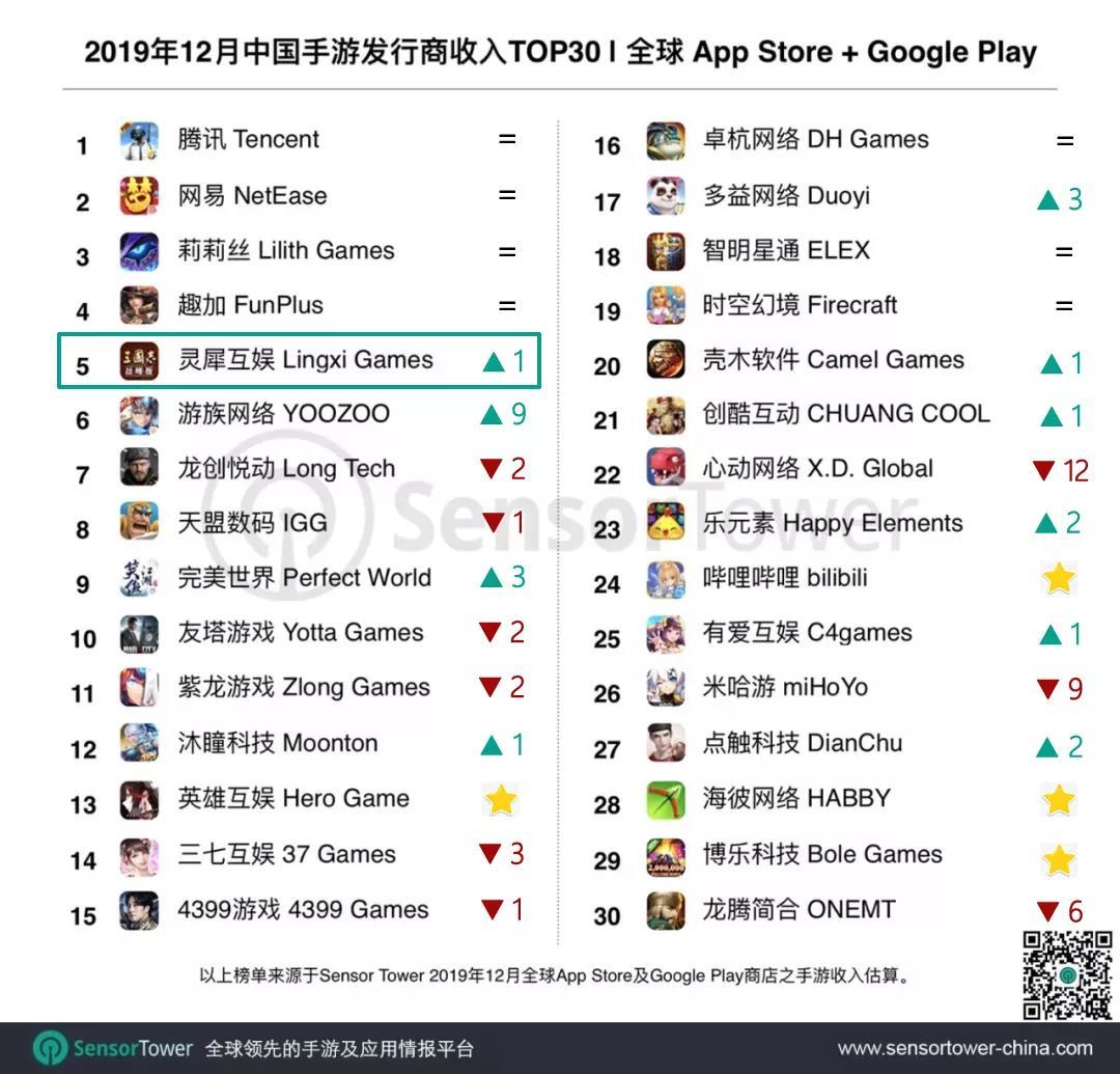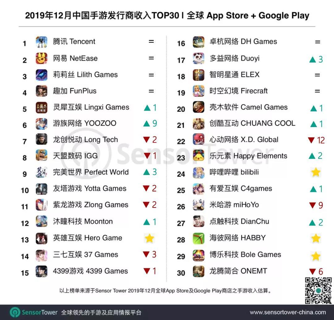 昨天(1月7日),SensorTower发布了2019年12月中国手游发行商在全球App Store和Google Play的收入排名。