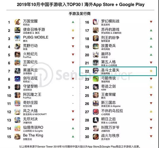 实际上从2019年下半年开始,游族网络在海内外市场的表现就非常不错。早在10月份,游族的《圣斗士星矢》便空降出海收入榜第22名,该游戏10月收入前三的市场为法国 (23.9%)、巴西(17.4%) 和中国香港(10.7%),成功出海。值得一提的是,法国和巴西作为收入头部市场,这在国产出海手游中并不多见。