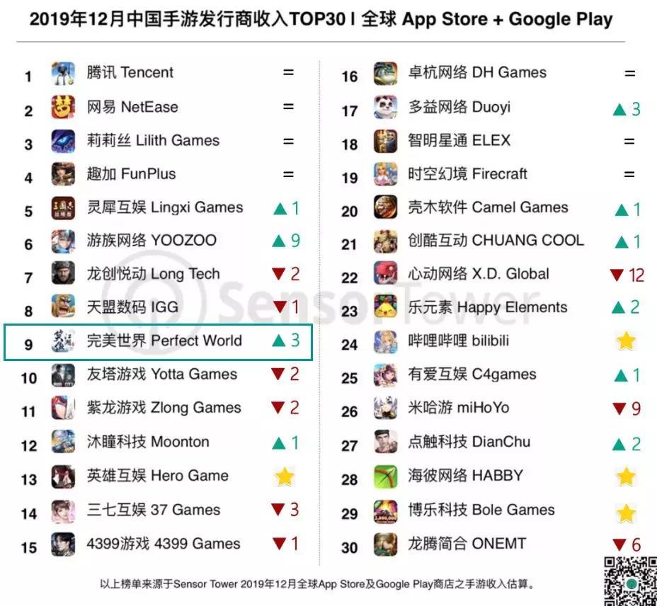 完美世界在12月的营收表现也非常不错,收入排名上升3位并跻身TOP10行列。