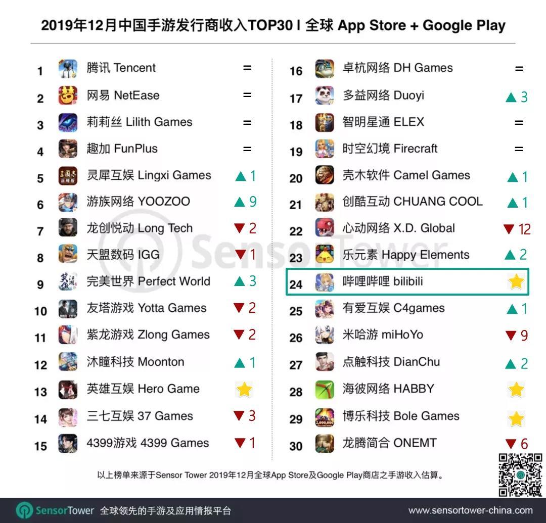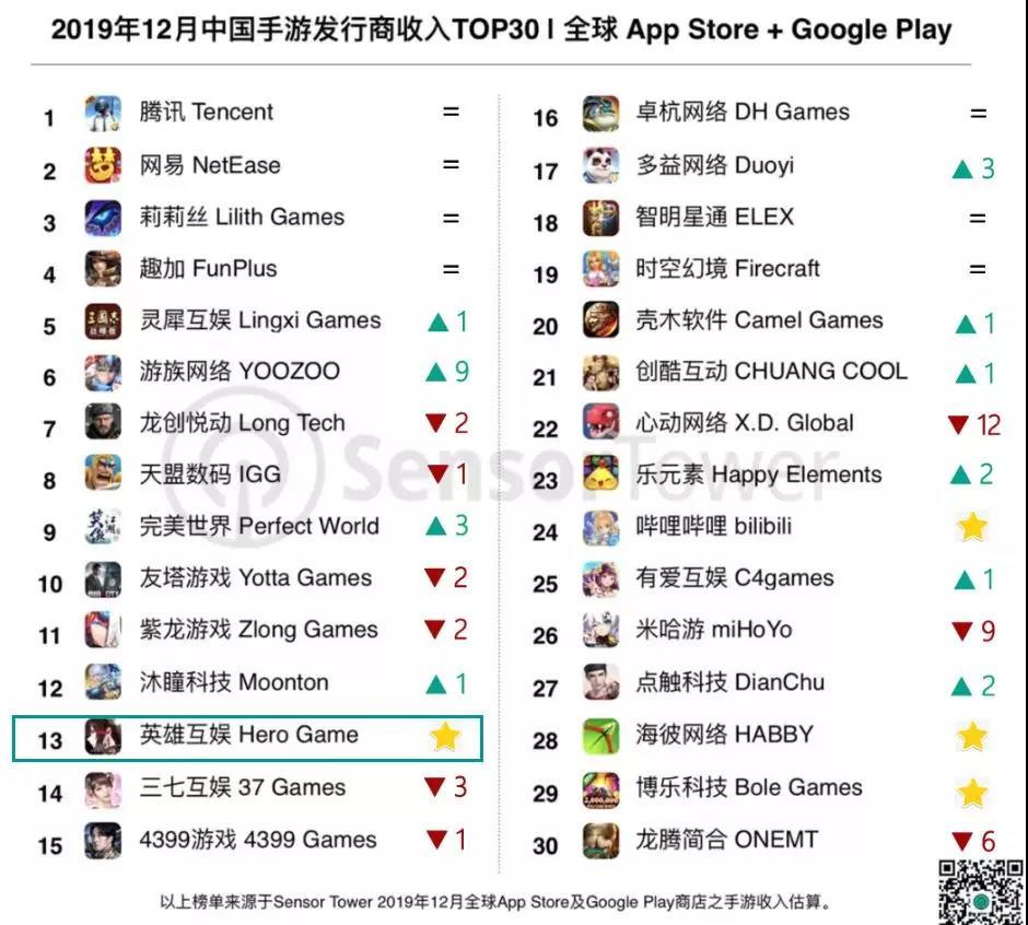 就收入环比增长而言,英雄互娱可以说是12月最大的赢家。得益于二次元手游《战双帕弥什》的优异表现,英雄互娱12月收入环比暴涨166%创下收入新高,并跃居榜单第13名。