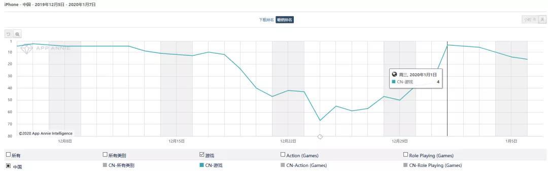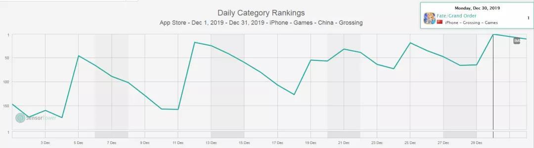 另外《命运-冠位指定》收入亦有所反弹。12月《命运-冠位指定》在国内iOS游戏畅销榜的排名也有着典型的“二次元特色”,并且在12月30号随着新角色限时卡池的开启,更是一举冲上了畅销榜首。