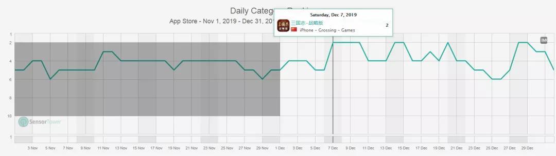 (《三国志·战略版》国内iOS游戏畅销榜排名变化,阴影部分为11月排名。可以明显看出游戏在12月的冲榜能力比11月要更强)