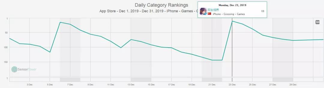 在过去的12月,尽管《双生视界》在国内iOS游戏畅销榜的排名波动比较大,但仍然两度打入了TOP20,并一度拿下了TOP11。而这种“平时排名一般,但活动期间排名就暴涨”的也符合二次元游戏的营收规律。