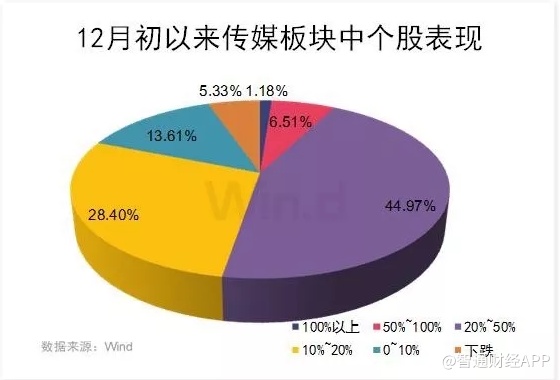 年底传媒板块全面受到资金青睐,Wind数据显示,自去年12月2日阶段低点以来,板块中169只个股,共有160只上涨,占比高达94.67%。其中引力传媒以涨幅177%遥遥领先,紧随其后中广天择、华扬联众等12家上涨超过50%。此外上涨20%~50%之间还有76家,可见近一个多月传媒板块中个股一片火热,成为资金持续买入的对象。