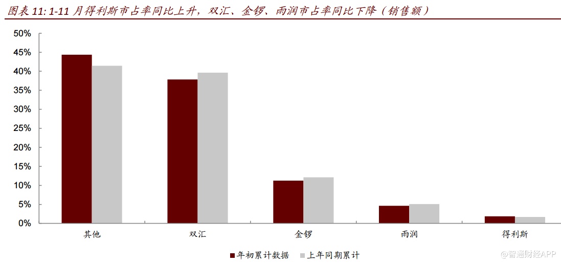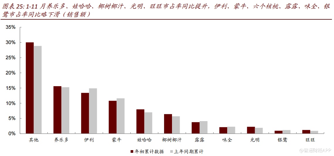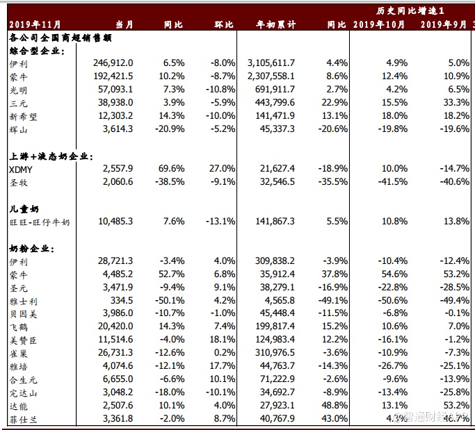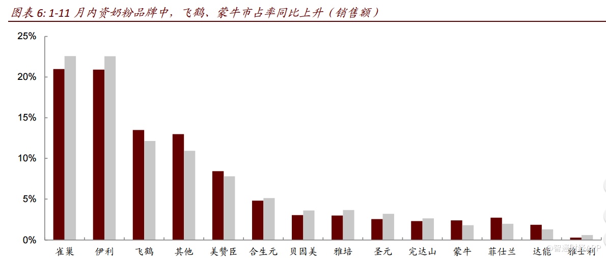 11月液奶收入维持较快增长,奶粉收入降幅收窄,但酸奶收入降幅扩大。11 月蒙牛收入增速10.2%,伊利6.5%,蒙牛增速继续保持领先。常温酸奶品类中,纯甄增速继续明显快于安慕希,莫斯利安仍有下滑,但单月环比持平。高端UHT奶中,特仑苏增长继续领先,金典增速环比下降。内资奶粉品牌中飞鹤、蒙牛年初至今市场份额提升。