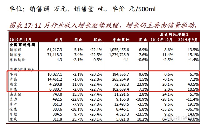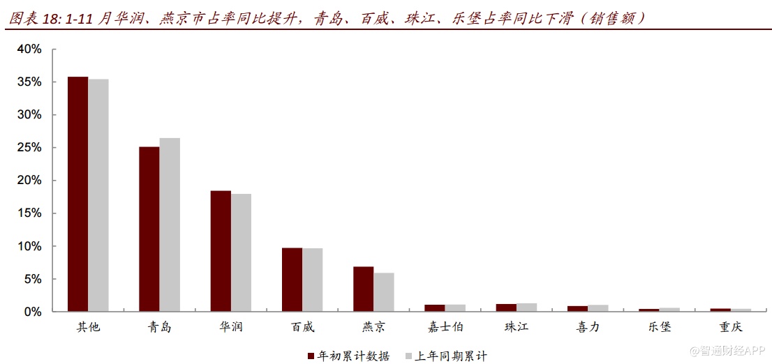 11月白酒收入加速增长,其中高端单品增速仍然快于行业,名酒品牌增速快于大众品牌,分化继续。啤酒收入11月增速继续放缓,年初至今啤酒在现渠的增长由销量推动。黄酒收入增速同比止跌回升。Rio预调酒11月收入加速增长 26.1%,其中新三度微醺继续高增67.6%。