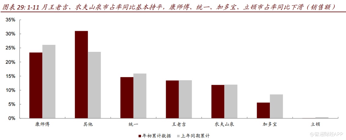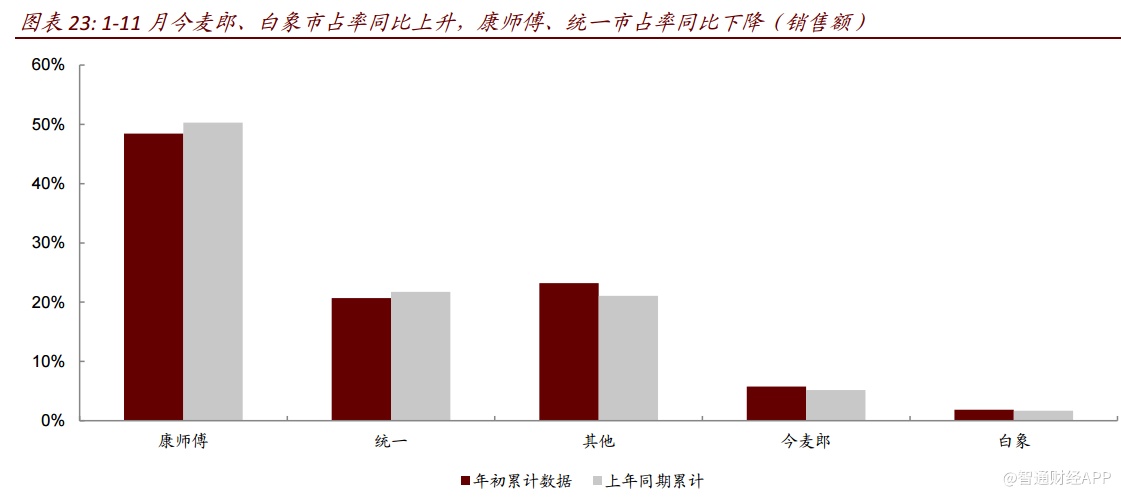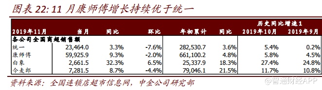 11月实现同比加速增长,其中袋装面加速势头明显,康师傅表现好于统一,今麦郎增速有所放缓。速冻米面食品中,面食、汤圆等其他子品类均有不同程度的环比提速。