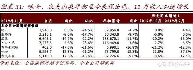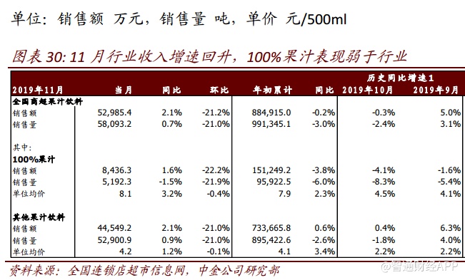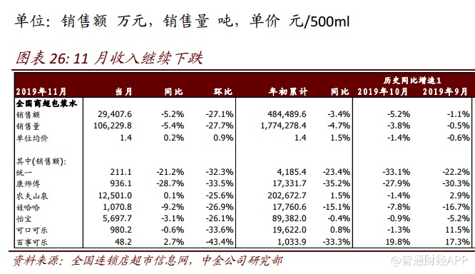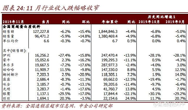 零售品中,除奶粉、酸奶、蛋白质饮料和包装水外,其余品类11月的现代渠道收入增速均有不同程度的加速增长,其中果汁饮料止跌回升。考虑2020年春节提前以及4Q18低基数,我们预计四季度整体增速有望环比三季度加速,11月数据该趋势已经初步显现。