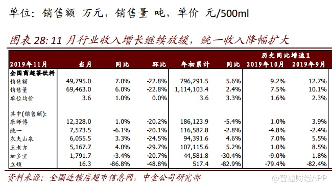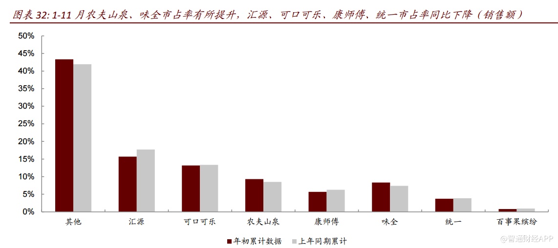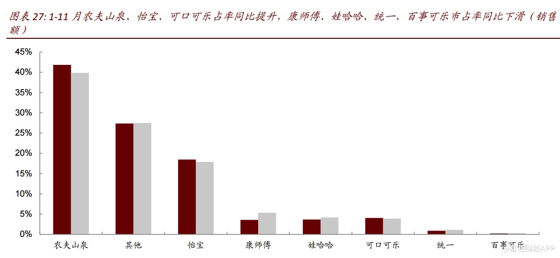 蛋白质饮料和包装水11月收入降幅收窄,果汁饮料则止跌回升。茶饮和碳酸饮料11月均实现较快增长。农夫山泉在各品类中综合表现相对最优。