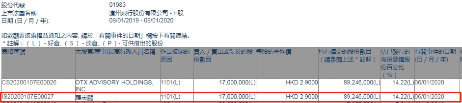 智通财经APP获悉,联交所最新资料显示,1月6日,股东罗志鹏增持泸州银行(01983)1700万股,每股作价2.90港元,总金额约为4930万港元。增持后最新持股数目约为8924.6万股,最新持股比例为14.22%。