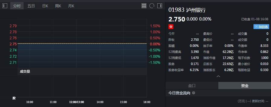截至今日收盘,泸州银行无涨跌,报2.75港元。