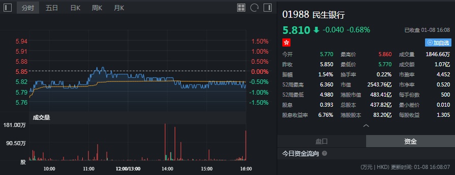 截至今日收盘,民生银行跌0.68%,报5.81港元。