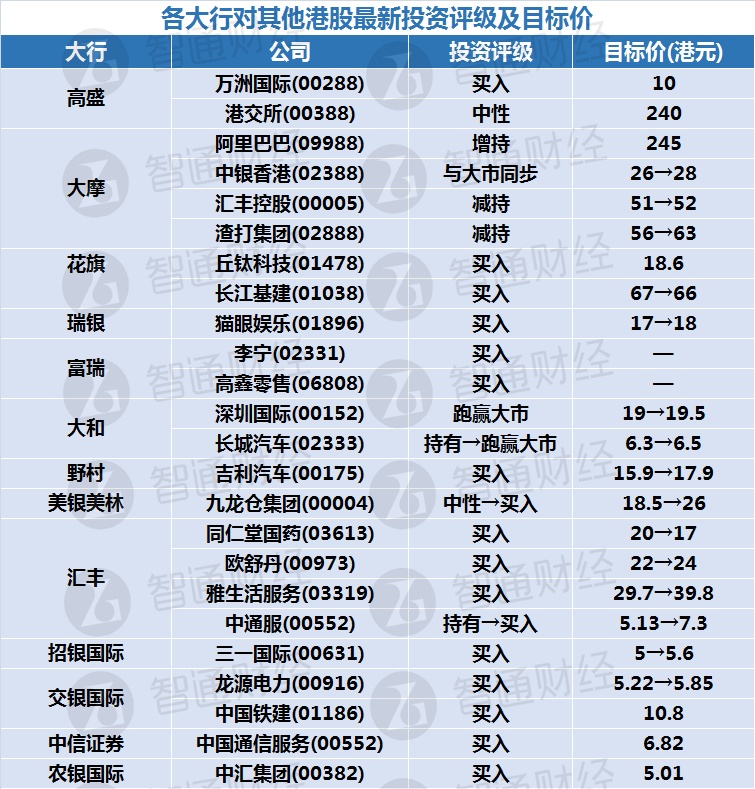 五、各大行对其他港股最新投资评级及目标价