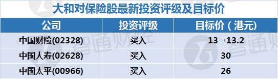 二、大和对保险股最新投资评级及目标价