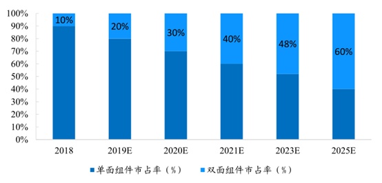 与此同时,双面组件渗透率上行同样有利光伏玻璃需求。智通财经APP了解到,双面组件采用双面电池封装而成,与普通单面组件相比,背面也能受光发电,可以实现8%-30%的发电量增益。2018年单面组件还是市场主流,市占率达到90%,主要应用于“领跑者”计划的双面组件市占率仅10%,但相比2017年已提高8pct,未来随着农光互补、水光互补等新型光伏应用的扩大,双面组件应用规模会不断扩大。根据《中国光伏产业发展路线图(2018年版)》,到2020年双面组件市占率有望达到30%,到2025年有望达到60%。而且作为全球重要光伏市场的美国,还有重新豁免双面组件201关税的预期,有望进一步加快双面组件渗透。