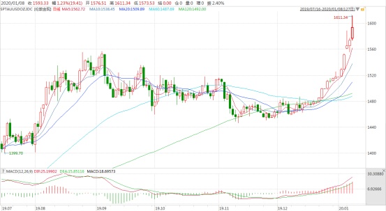 截至发稿,现货黄金报价约1581美元/盎司。值得注意的是,现货黄金价格在1月3日突破了1550美元大关后直奔1600美元整数关口,1月8日更是创下了近7年以来的最高纪录,盘中达到1611.34美元/盎司。而自1月1日至今,伦敦金价格一度累涨近5%。