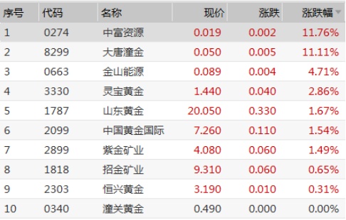 在国际金价大幅上涨的同时,一向“不动则已,一动惊人”的黄金板块在整体下跌的市场中尤为亮眼,截至收盘,板块内个股基本收涨,中国白银集团(00815)涨3.26%,报0.95港元;招金矿业(01818)涨0.65%,报9.31港元;山东黄金(01787)涨1.67%,报20.05港元;紫金矿业(02899)涨1.49%,报4.08港元,就连恒生人民币黄金ETF都顺势涨2%。