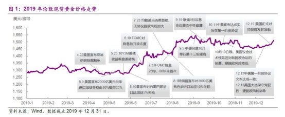 事实上,回顾2019年以来国际黄金价格走势可以发现,国际金价一直紧跟全球宏观环境的变化而波动,在中美贸易摩擦有所缓和时,风险资产价格上行,避险资金流出导致黄金价格受到压制。但整体来看,2019年内,在市场普遍较为担忧美债收益率倒挂、经济衰退危机及贸易关系紧张等多重因素作用下时,作为避险资产的代表,国际金价全年大涨19%。