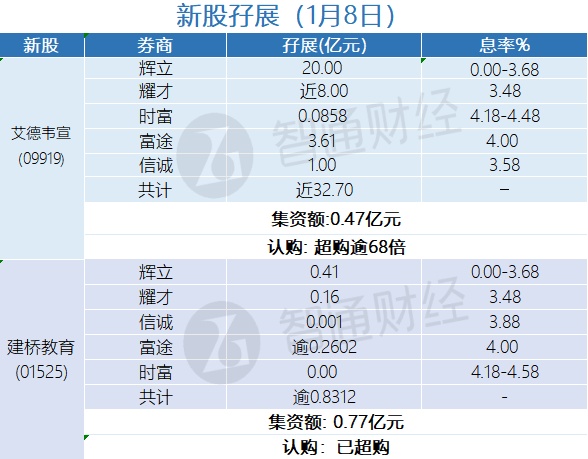 智通财经APP获悉,1月8日,艾德韦宣(09919)、隽思集团(01412)、GHW(09933)、驴迹科技(01745)、中关村科技(01601)、汇景控股(09968)、佳辰控股(01937)、Infinity L&T(01442)、建桥教育(01525)正在招股中。