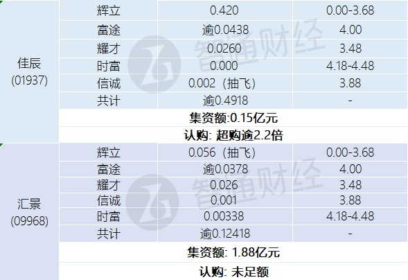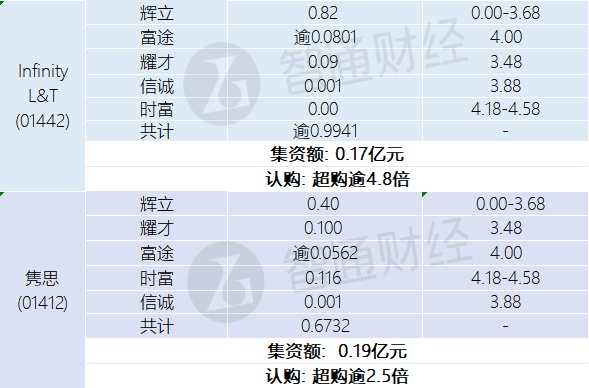 其中艾德韦宣超购逾68倍,建桥教育为已超购,隽思超购逾2.5倍,GHW超购逾3.5倍,驴迹科技超购逾20倍,佳辰控股超购逾2.2倍,Infinity L&T超购逾4.8倍,其余两家未足额。