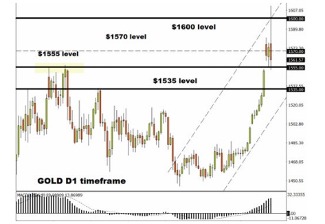 如果1555美元被证明是一个不可靠的支撑位,金价可能会进一步下跌。跌破这一点位应会促使金价跌向1535美元。现货黄金现交投于1555美元,这意味着黄金还将下跌20美元。