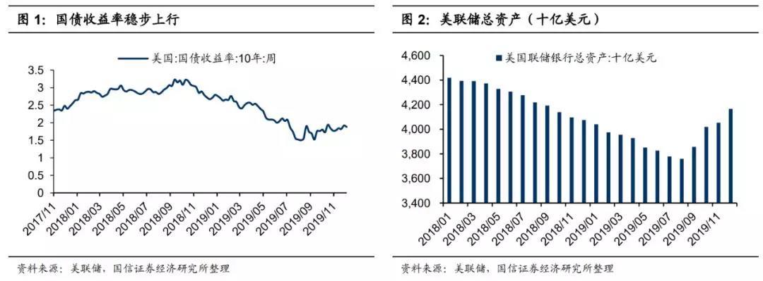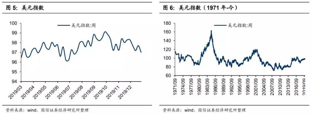 2019年8、9、10月利率三连降之后,美元指数在10月开始出现了明显的下行,这符合了我们的判断。我们在2019年下半年策略报告《金融与周期的大时代》中指出:“目前,美元指数在中周期的下降周期中,下一个低点时间约在2022年12月-2023年11月,短周期的走强是因为基钦周期在收缩期中,预计,2019年11月之后(基钦周期走强),伴随美元降息,美元指数将呈现逐步回落的局面。”当时,正是美元指数上涨的鼎盛时间,市场或对该观点尚存质疑,目前的走势与我们的判断相符,并且,美元指数的走弱,将持续明、后年全年的时间。
