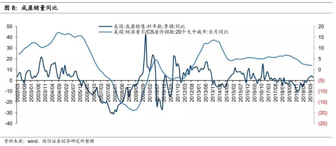 我们或许需要思考,为什么在2018年年底美国的成屋销量开始回升?彼时还处在升息周期,并没有货币政策的刺激。我们认为,短周期修复的特点是,它富有规律,间隔大约4-5年。如上一次低点是2014年中,再上一轮低点是2010年,再之前是2007年。综合而言,短周期上升可能的原因是:1)刚需的集中积累,2)降税后收入的提升,3)三连降之后贷款利率更低刺激了购房需求,4)全球资产荒环境下,资产再配置的需要。无论如何,我们看到,历史上短周期的回暖,呈现的趋势是能够持续2-3年,几乎没有刚刚启动就戛然而止的情形。