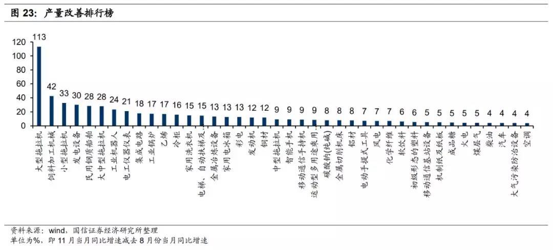 我们跟踪的87个子行业中,11月份对比8月份,改善的行业有53个,恶化的行业为28个,改善的行业数量明显大于恶化的行业数量。我们将3个月改善的幅度做一对比,列举如下。可以看出,拖拉机、工业机器人、集成电路、家用洗衣机、冰箱、彩电、发动机,铜材,改善空间都在10以上;智能手机、汽车、空调、火电等也有一定程度的改善。