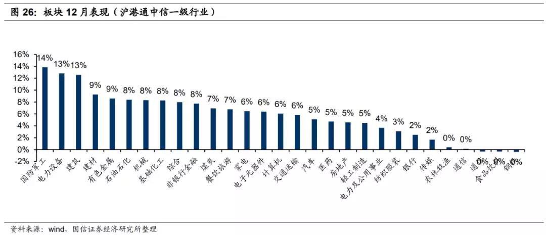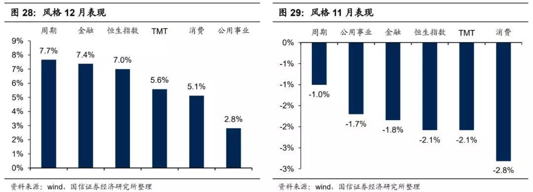12月国企指数显著跑赢本地股,且中小型股较大型股表现更强,这表现了风险偏好的稳步上行;在行业风格上,周期上游开始发力,周期普涨,金融亦有上攻迹象。