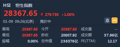 智通财经APP获悉,恒生指数开盘涨279.73点或1%,报28367.65点。国企指数涨0.97%,报11186.87点。红筹指数涨0.68%,报4531.17点。大市盘前成交37.97亿港元。