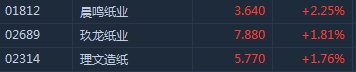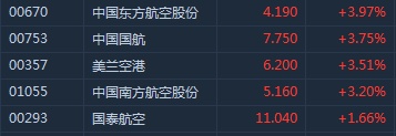 截至9时53分,东航(00670)涨3.97%,报价4.19港元,国航(00753)涨3.75%,南航(01055)涨3.2%。晨鸣纸业(01812)涨2.25%,玖龙纸业(02689)涨1.81%,理文造纸(02314)涨1.76%。