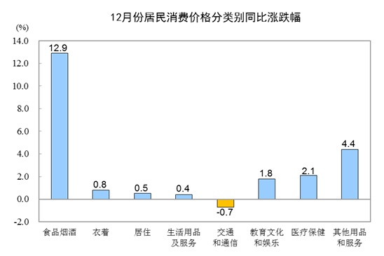 12月份,食品烟酒类价格同比上涨12.9%,影响CPI(居民消费价格指数)上涨约3.82个百分点。食品中,畜肉类价格上涨66.4%,影响CPI上涨约2.94个百分点,其中猪肉价格上涨97.0%,影响CPI上涨约2.34个百分点;鲜菜价格上涨10.8%,影响CPI上涨约0.26个百分点;蛋类价格上涨6.2%,影响CPI上涨约0.04个百分点;水产品价格上涨1.3%,影响CPI上涨约0.02个百分点;粮食价格上涨0.6%,影响CPI上涨约0.01个百分点;鲜果价格下降8.0%,影响CPI下降约0.15个百分点。