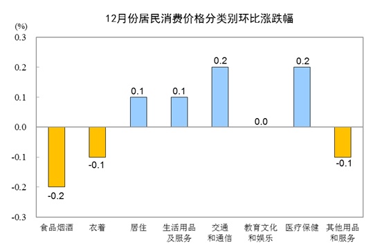 12月份,全国居民消费价格环比持平。其中,城市持平,农村下降0.1%;食品价格下降0.4%,非食品价格上涨0.1%;消费品和服务价格均持平。