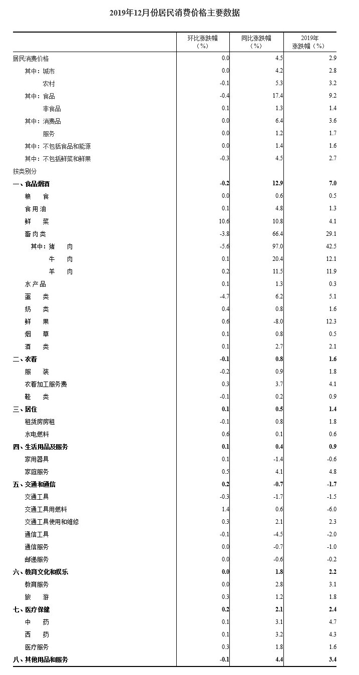 智通财经APP获悉,统计局今日公布,2019年12月份,全国居民消费价格同比上涨4.5%。其中,城市上涨4.2%,农村上涨5.3%;食品价格上涨17.4%,非食品价格上涨1.3%;消费品价格上涨6.4%,服务价格上涨1.2%。
