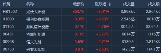 智通财经APP获悉,近日A股热炒HIT光伏电池概念,港股光伏股跟随走强。截至发稿,保利协鑫能源(03800)涨9.23%,报0.355港元;协鑫新能源(00451)涨3.77%,报0.165港元;信义光能(00968)涨2.71%,报5.69港元;兴业太阳能(00750)涨2.53%,报0.81港元。