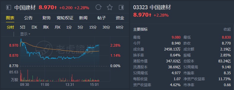 该行表示,将中国建材的投资评级由“中性”升至“买入”,目标价11.7港元。