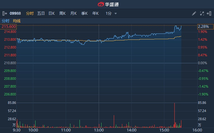 智通财经APP获悉,阿里巴巴(09988)午后获资金青睐涨逾2%,盘中高见215.6港元刷新上市以来新高,较招股价176港元已涨22%。截至发稿,涨2.18%,报215.4港元,成交额21.95亿港元。